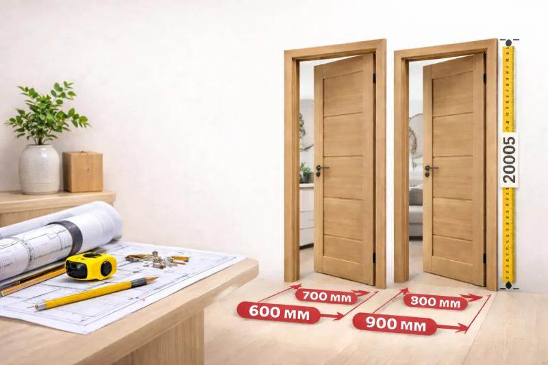 Для полотна 800×2000 мм требуется проем шириной 870–910 мм и высотой 2050–2100 мм — с зазорами 10–20 мм по бокам и верху.